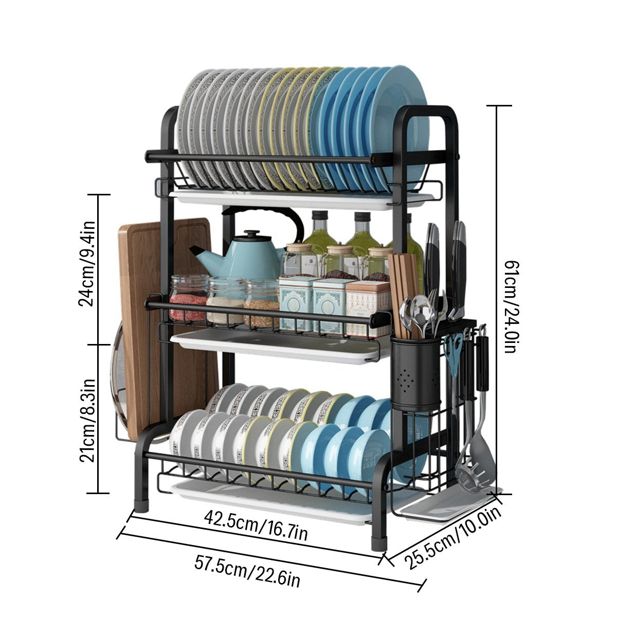تحتوي هذه الحاملة على ثلاث طبقات تمكنك من تخزين أحجام مختلفة من أدوات المائدة والصحون والأواني ولوحات التقطيع والأكواب.